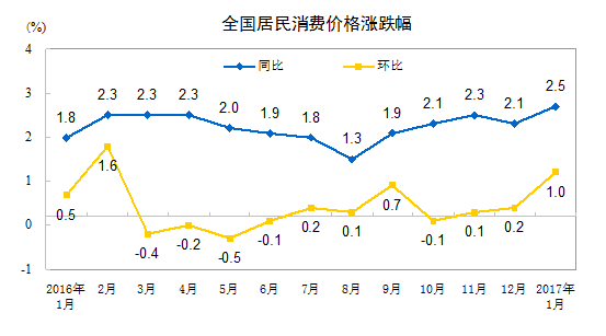 2017年1月份,全國居民消費價格總水平同比上漲2.5%。其中,城市上漲2.6%,農(nóng)村上漲2.2%;食品價格上漲2.7%,非食品價格上漲2.5%;消費品價格上漲2.2%,服務(wù)價格上漲3.2%。
