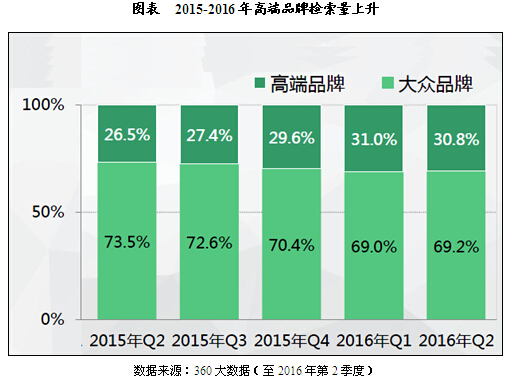 據(jù)市場調(diào)查公司了解,2015年2季度開始,高端品牌的檢索量占比逐漸擴大,消費者對高端品牌的消費需求更加旺盛。 2016年,高端品牌,品牌數(shù)量少集中度高,Top10品牌檢索量占比近60.0%,其中雅詩...