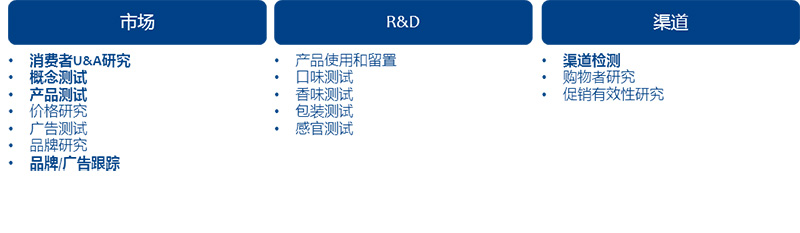 消費(fèi)品(快消品)研究包含可行性研究、消費(fèi)者U&A研究、概念測試、市場細(xì)分研究、產(chǎn)品測試、新產(chǎn)品創(chuàng)新開發(fā)、品牌研究及品牌定位、品牌評(píng)估與傳播、廣告及活動(dòng)效果評(píng)估、服務(wù)滿意度研究、渠道監(jiān)測等等。華夏經(jīng)緯研究團(tuán)隊(duì)提供新產(chǎn)品從機(jī)會(huì)識(shí)別到上市、量產(chǎn)及升級(jí)的全流程服務(wù)。