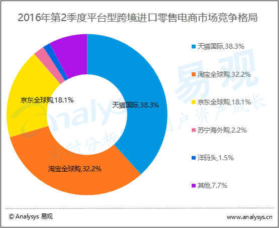 在平臺型跨境進口零售電商中,阿里巴巴旗下的天貓國際、淘寶全球購居于領先地位,其份額分別達到了38.3%和32.2%,而京東全球購緊隨其后,擁有18.1%的份額;以上三個平臺占據(jù)了平臺型跨境進口零售市場中近九成的份額,遙遙領先于其他廠商,在市場中有絕對的影響力。另外,蘇寧海外購、洋碼頭分別以2.2%和1.5%的份額排在第四、第五位,其還有進一步擴大市場份額的空間。