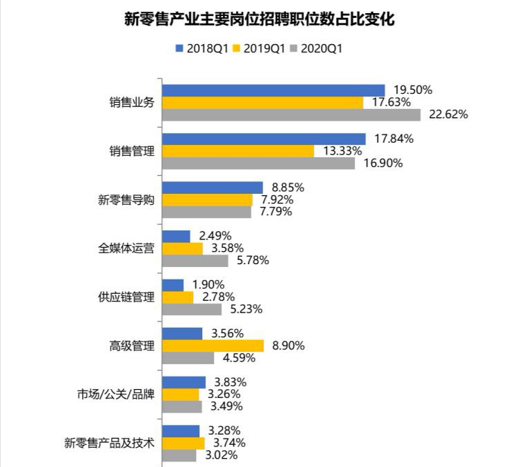 ToB的銷售和ToC的導(dǎo)購(gòu)是新零售的主體崗位,2020年一季度,銷售業(yè)務(wù)、銷售管理和新零售導(dǎo)購(gòu)崗位的招聘職位數(shù)分別占新零售總體的22.62%、16.90%、7.79%。全媒體運(yùn)營(yíng)、供應(yīng)鏈管理等新零售中臺(tái)崗位招聘需求保持增長(zhǎng)態(tài)勢(shì),2020年一季度招聘職位數(shù)占比較2018年一季度均提高超過(guò)3個(gè)百分點(diǎn)。
