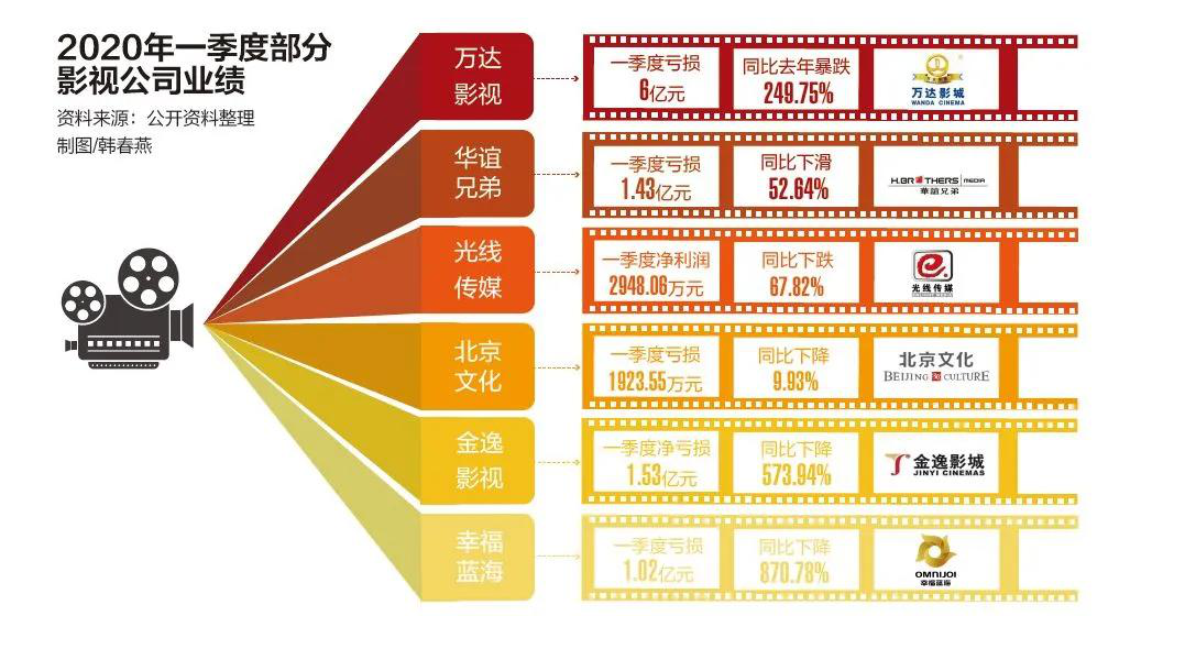 影院停業(yè)、電影撤檔的背后,上市影視公司業(yè)績一片慘淡。萬達電影一季度營收同比下跌70.12%,虧損近6億元,同比去年暴跌249.75%。中國電影一季度營收同比下降88.39%,虧損2.27億元,同比去年暴跌163.95%。此外,華誼兄弟、橫店影視、金逸影視等一季度均處于虧損狀態(tài)。