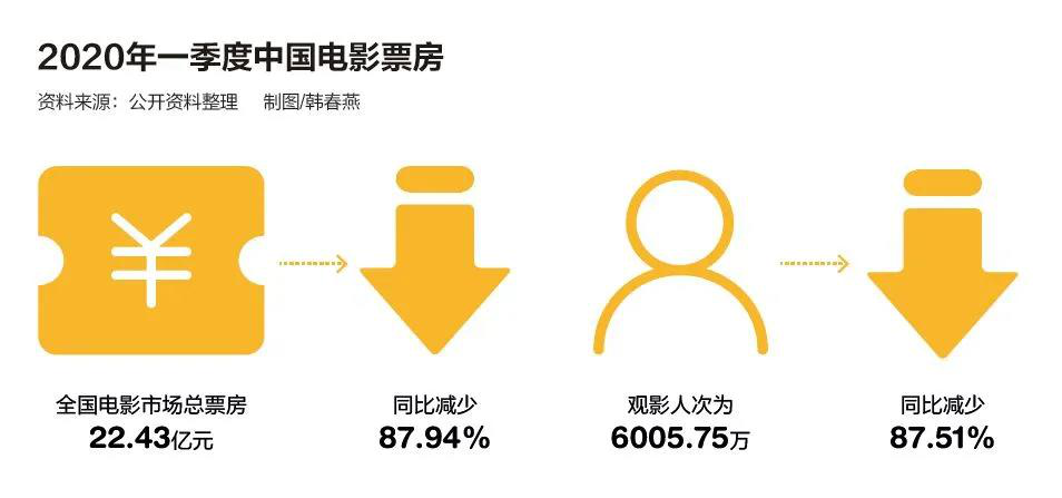 藝恩數(shù)據(jù)顯示,2020年一季度,全國電影市場總票房22.43億元,同比減少87.94%;觀影人次為6005.75萬,同比減少87.51%。電影票房和觀影人次的暴跌,使得包括影視制作公司、宣傳發(fā)行公司、院線公司在內(nèi)的整個電影行業(yè)都不景氣。